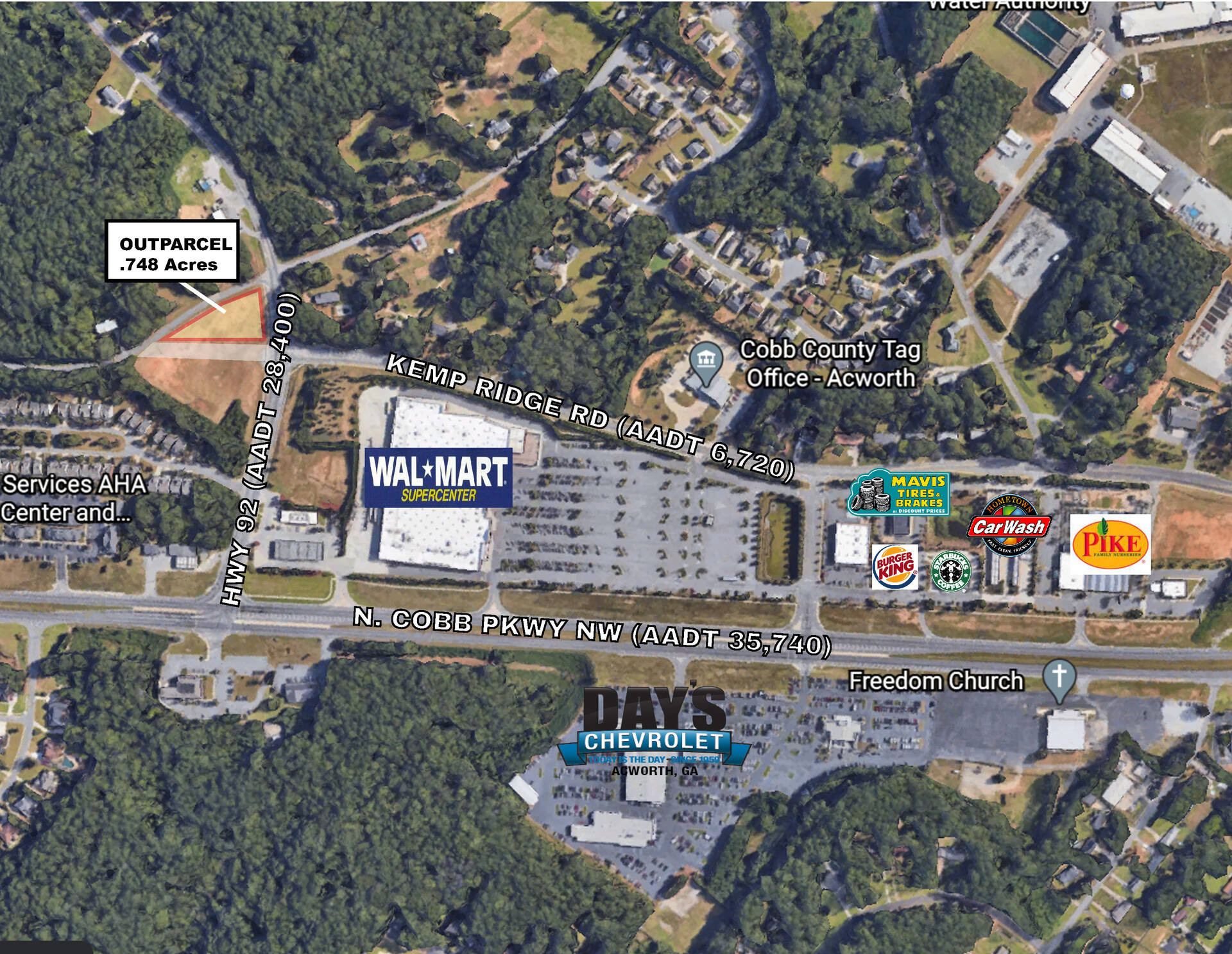 One .748 acre lot available on the Cobb Parkway corridor (Highway 41 at Highway 92) in Acworth, Georgia. Within 5 miles of the site, household incomes average in excess of $117,000. With the recent expansion of Highway 29, the traffic counts have increased from 27,000+ vehicles to 35,000+ per day.