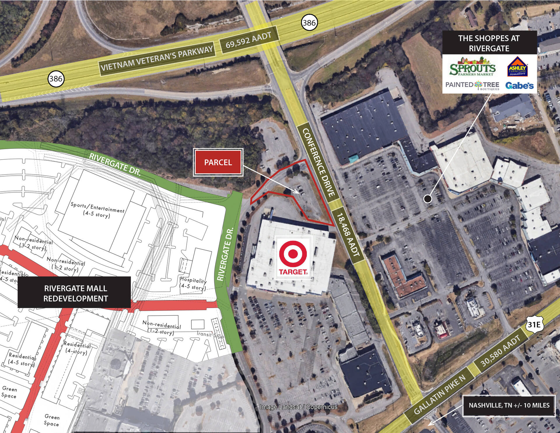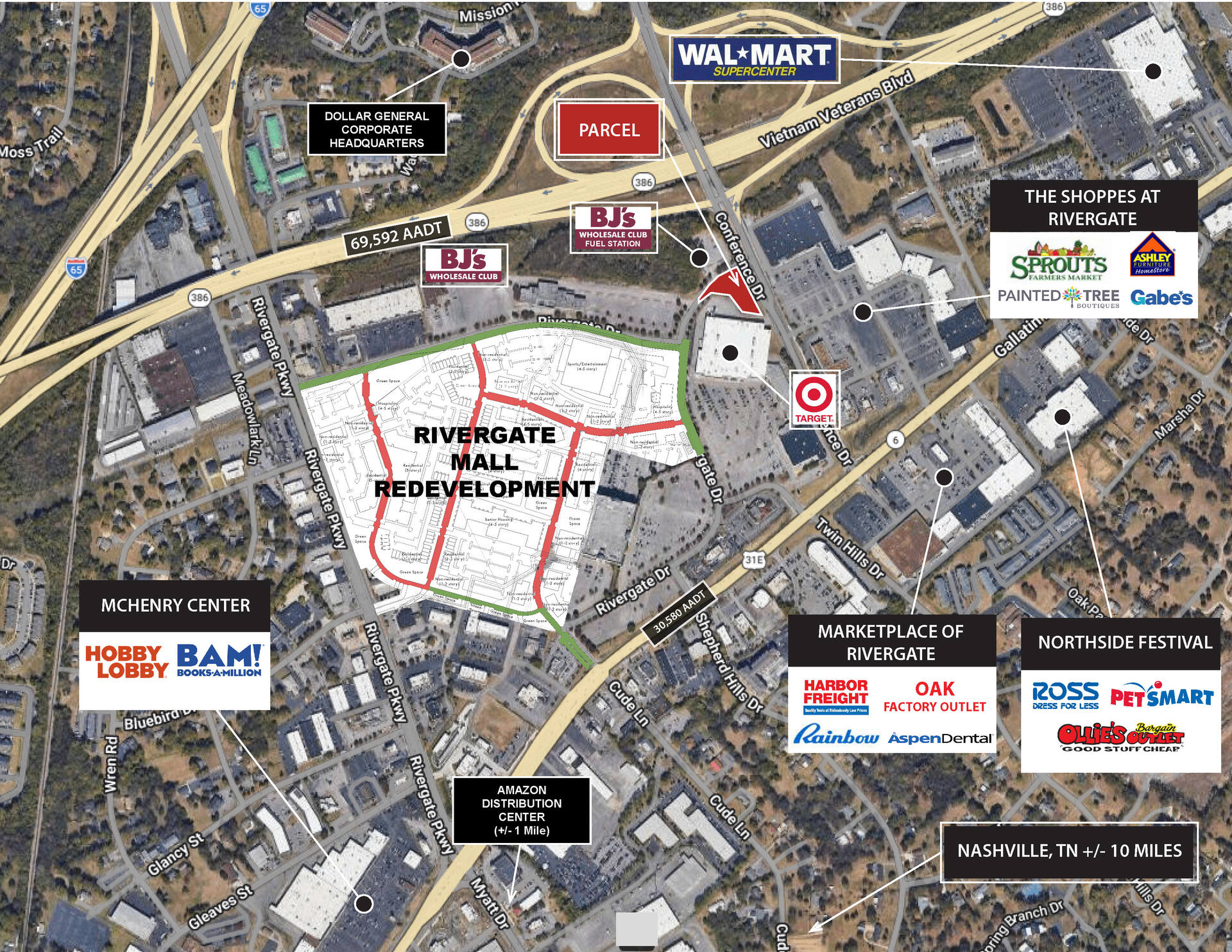 One 1.04 acre parcel available on Conference Drive in Madison, TN just off of Vietnam Veterans Blvd (70,000 VPD) with immediate access to and from Interstate 65 and minutes from downtown Nashville. The parcel is ideally located at the entrance to the 57-acre redevelopment of RiverGate Mall, now underway.