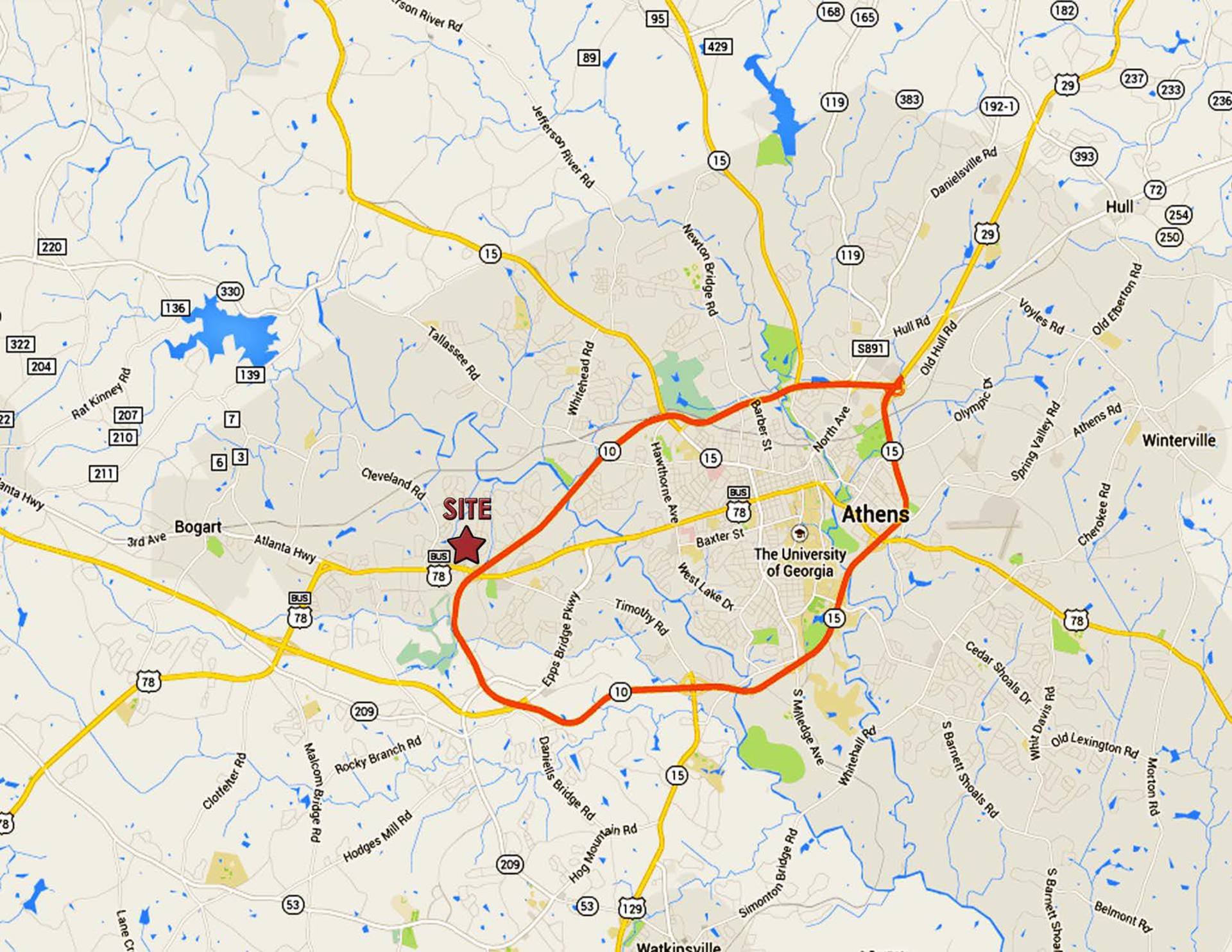 Over 34,000 vehicles per day on Atlanta Highway, the main frontage road.