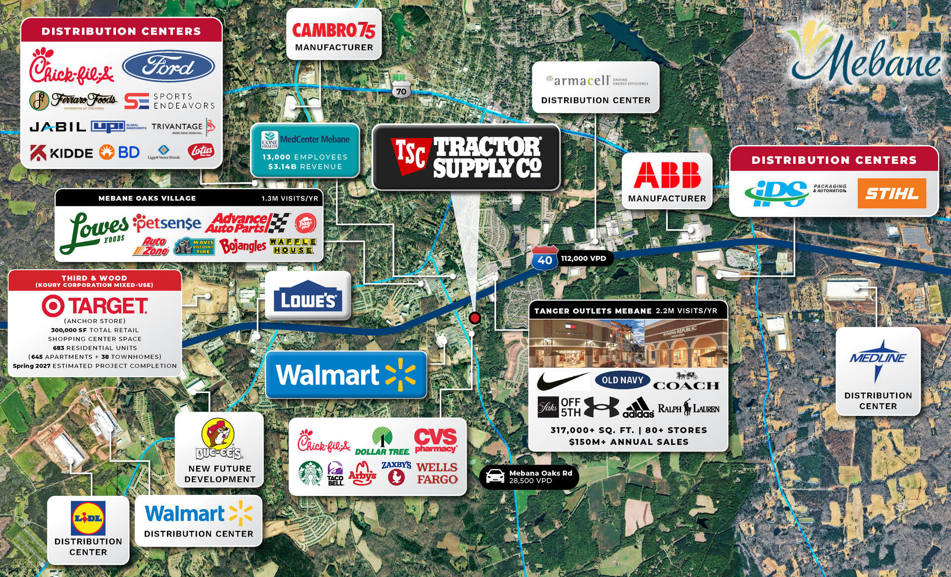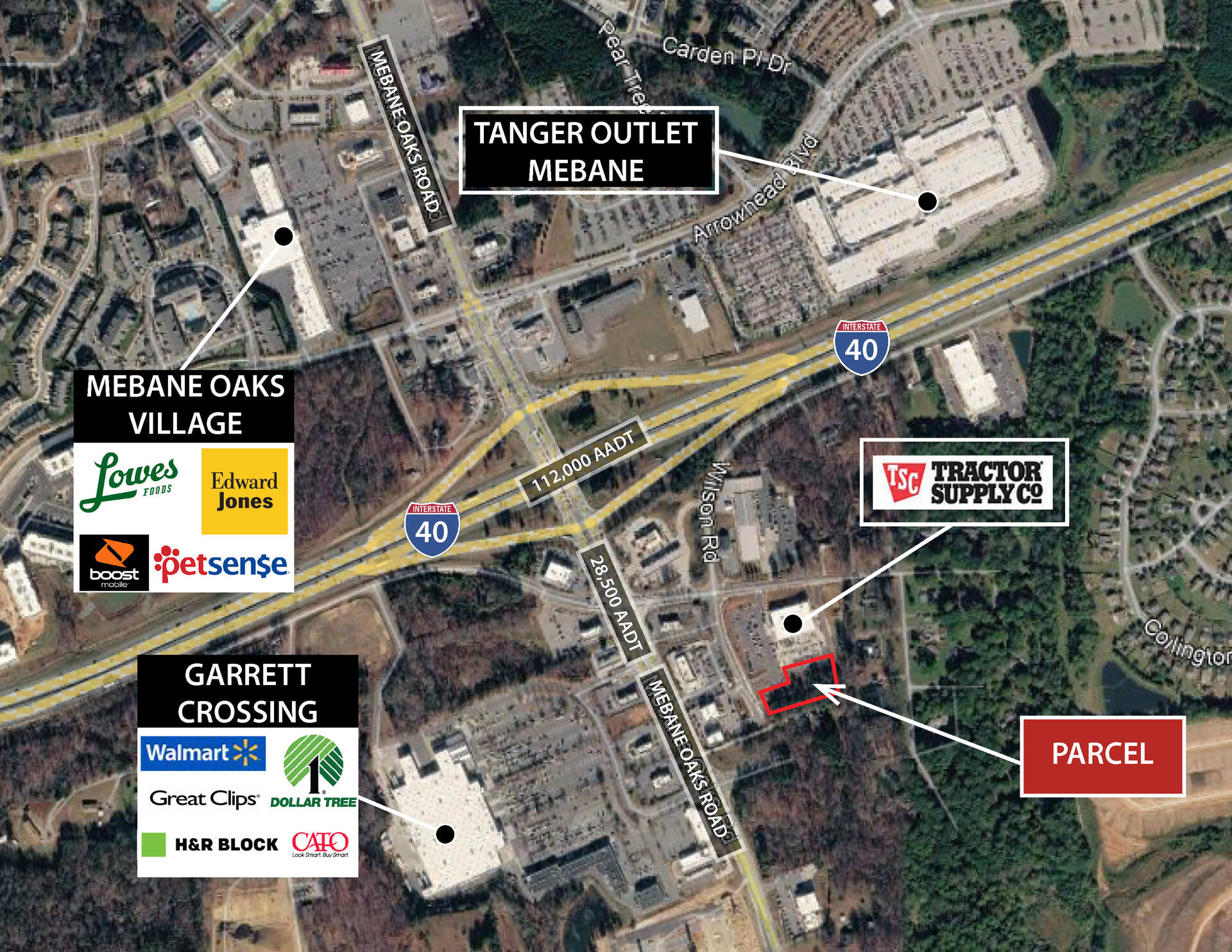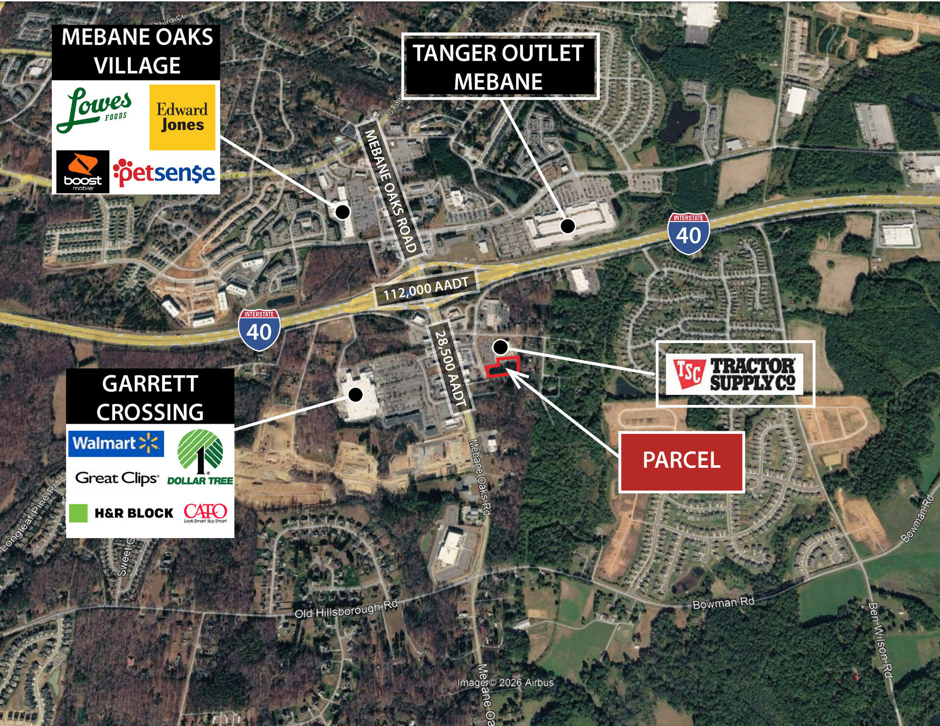 One 1.35 acre parcel just off of Mebane Oaks Road (28,500 AADT) and Interstate 40 (112,000 VPD). The parcel is situated beside a newly constructed Tractor Supply (2025) and just across the highway from Tanger Outlets Mebane.