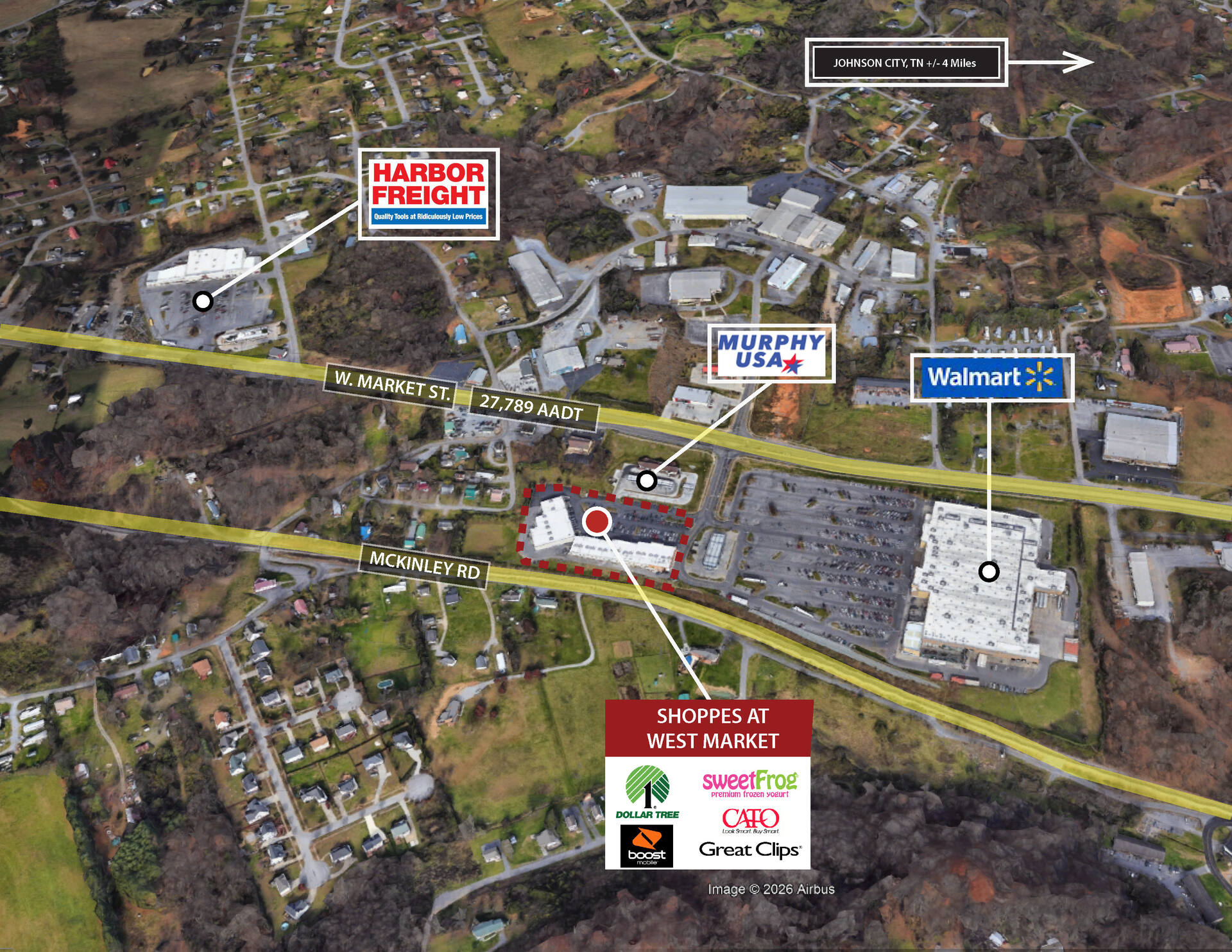 Shoppes at West Market is a 40,760 sq. ft. shopping center located in Johnson City, Tennessee. The center is shadow-anchored by a high-performing Walmart since 2006. Located just off Interstate 381, this Walmart serves as the primary Walmart to Johnson City.