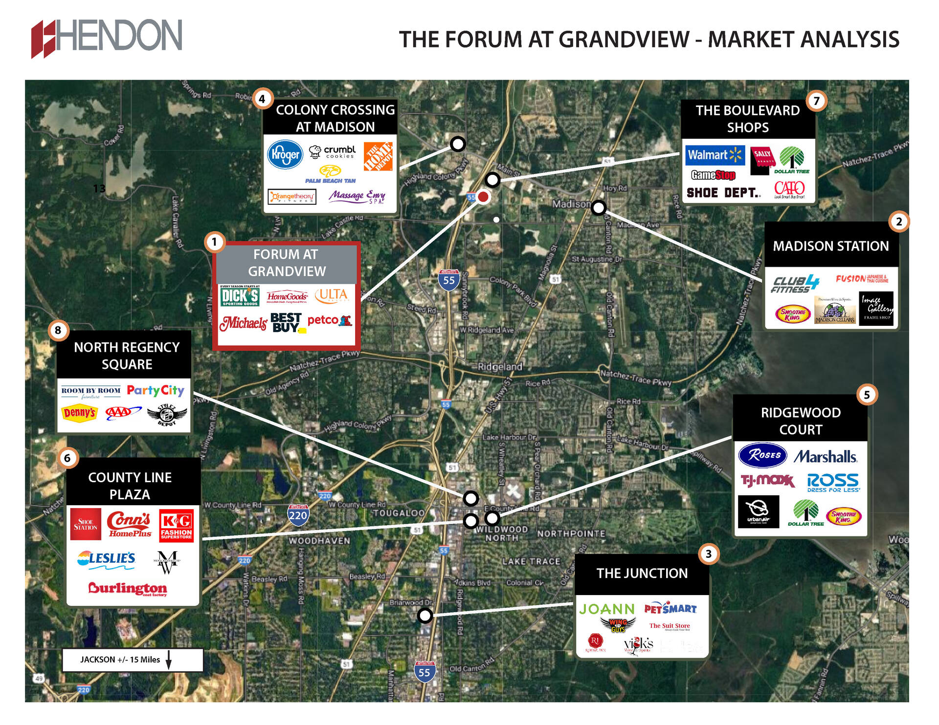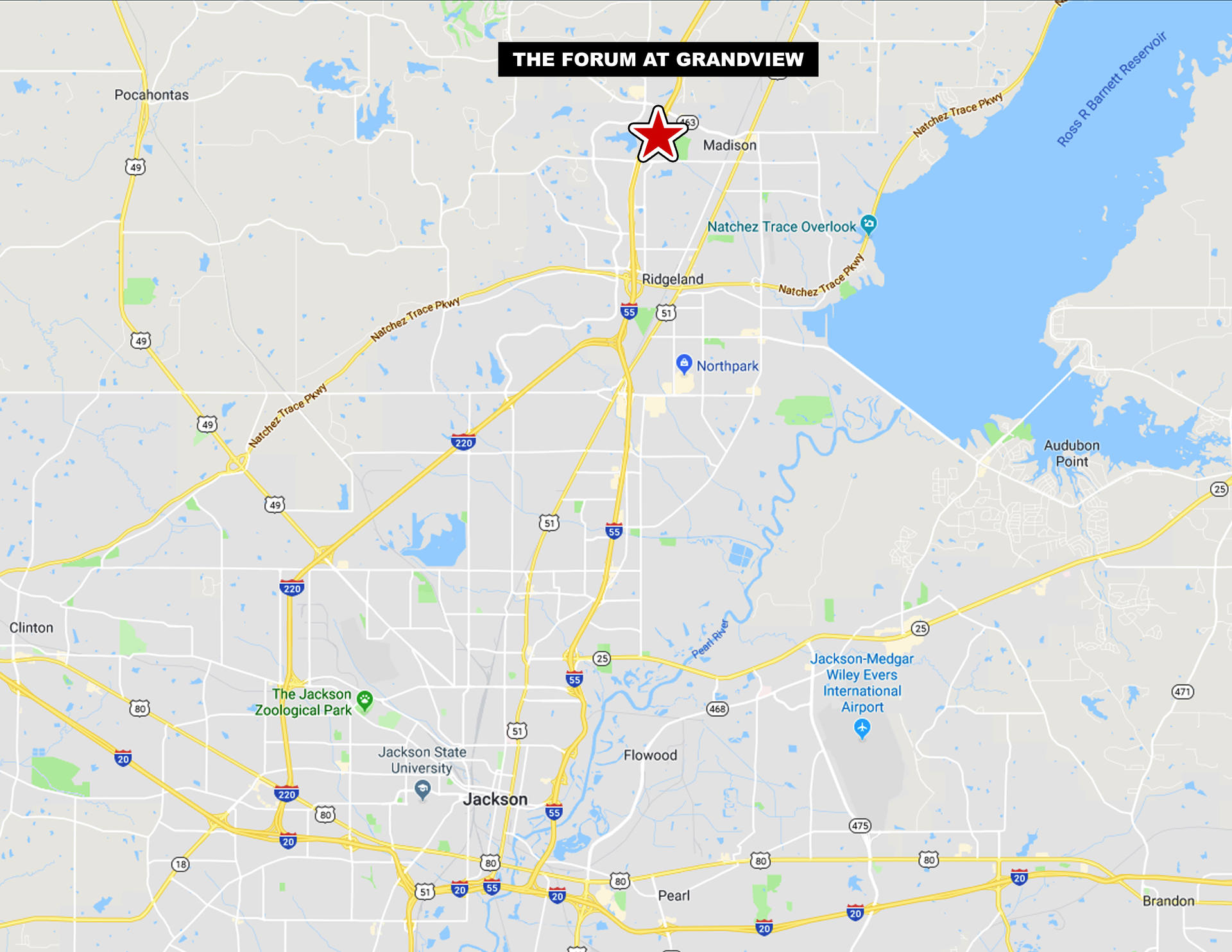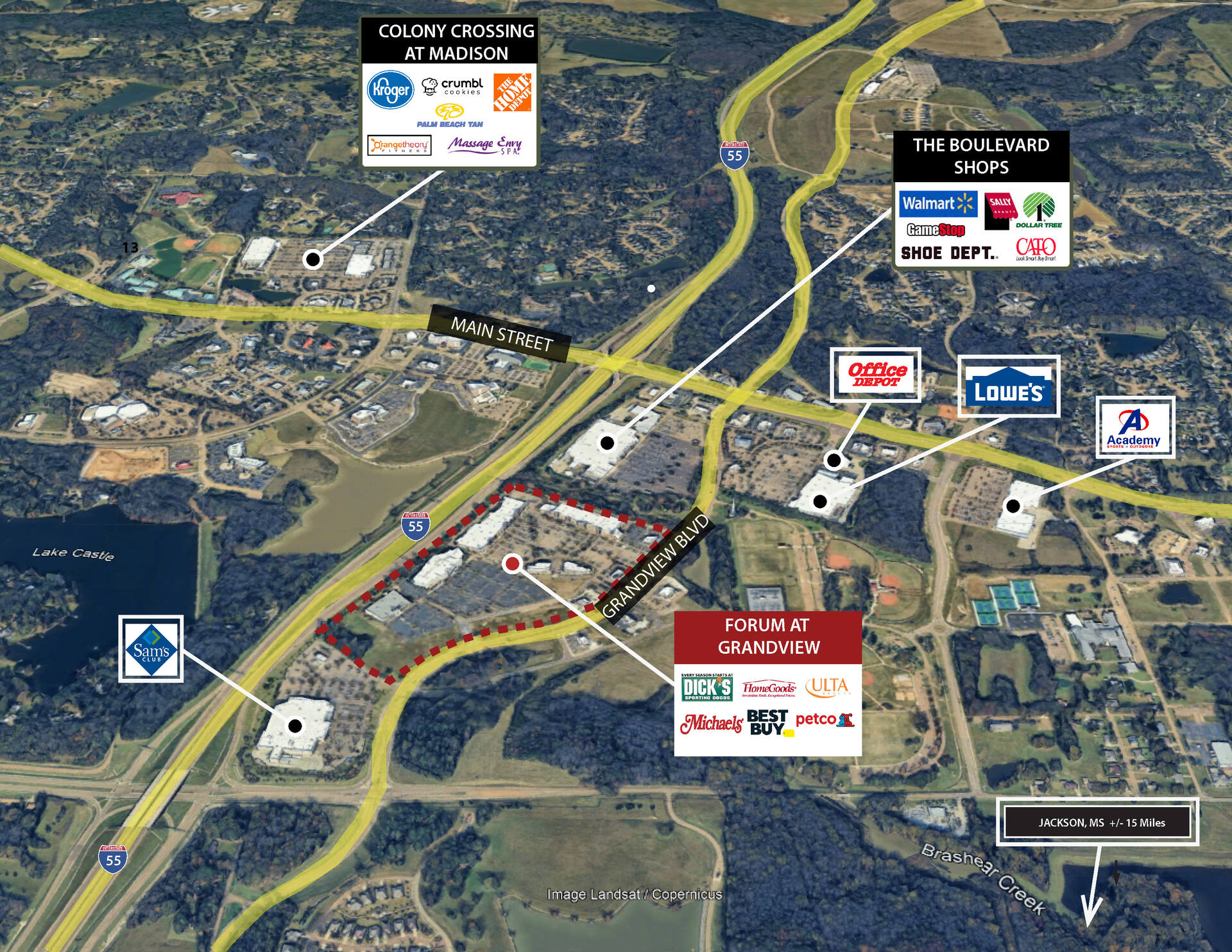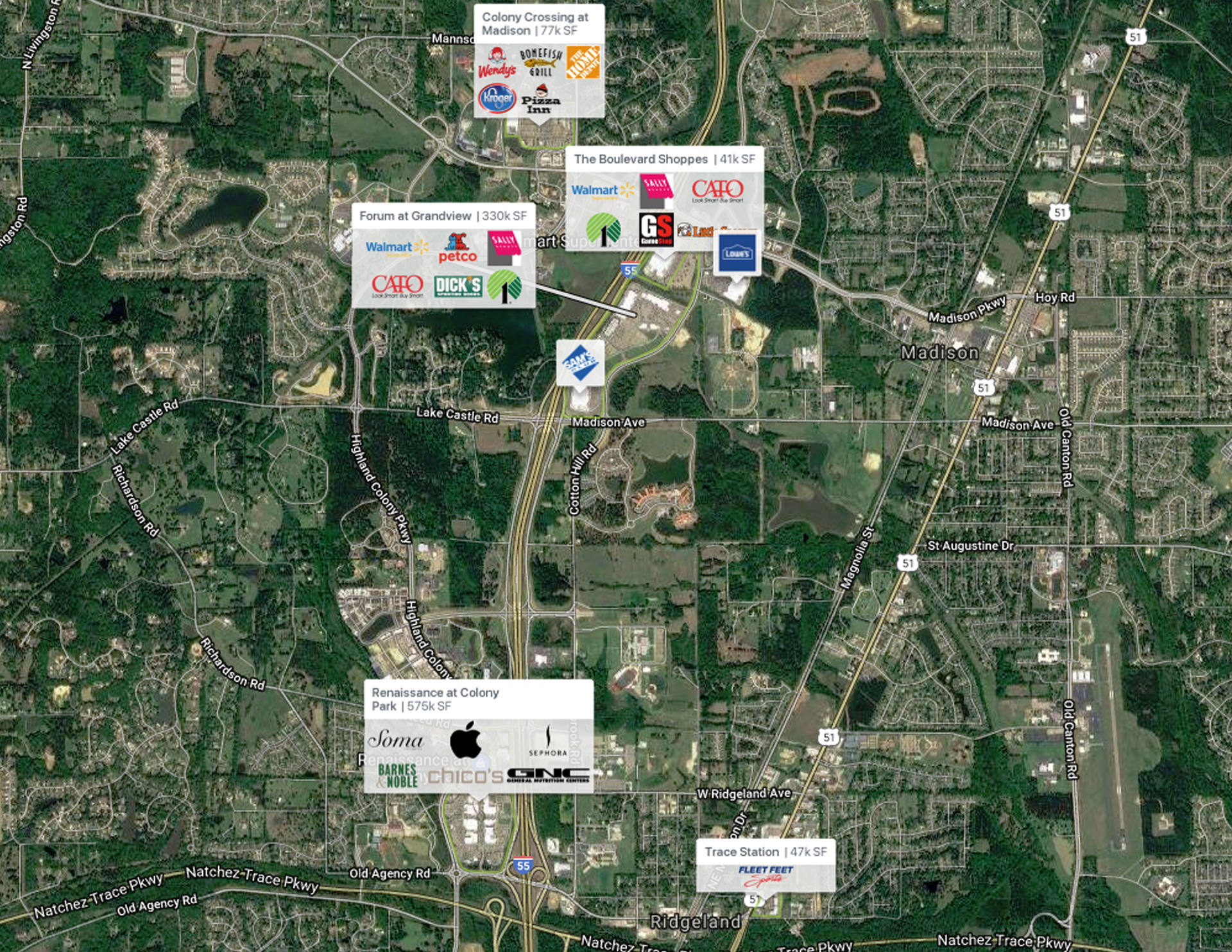 The Forum at Grandview is the prime retail destination in Madison, MS, an affluent and growing suburb of Jackson. The center is highly visible to Interstate 55 and anchored by top national retailers Dick's Sporting Goods, Home Goods, Best Buy, Michaels, Petco, and ULTA. The architectural prominence stands out among the immediately adjacent retail including Wal-Mart, Sam’s Club, Malco Theaters, and Miskelly Furniture. The site contains approximately 8 acres of developable outparcels.